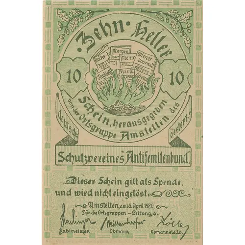 | Obverse lettering | Zehn Heller Schein, herausgegeben von der Ortsgruppe Amstetten des deutsche oesterr.- Schutzvereines `Antiſemitenbund`. Deiser Schein gild als Spende und wird nicht eingelöst Amstetten, am 16. April 1920 für die Ortsgruppen - Leitung (Translation: Ten Heller Note, published by the Amstetten Local Group of German-Austrian Protection Organization `Anti-Semitic League`. This note is a donation and will not be redeemed Amstetten, April 16, 1920 for the Local Group Management) |