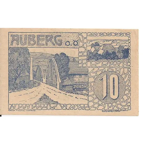 | Reverse lettering | Aus Papier dö ganze Welt, Warum nöt a das Auberger Geld; Fürdiesen Schein kriegst Bier u. Wein, Doch müssen ihrer viele sein, Gutschein der Gemeinde Auberg. Die Ortsgemeinde Auberg haftet laut Gemeinderatsbeschluß vom 13. Juni 1920 für die Verbindlichkeit, diesen Schein vier Wochen nach Bekanntgabe in gesetzlichem Bargelde einzulösen Nachahmung wird gesetzlich bestraft, Der Bürgermeister: 1. Aufl. |