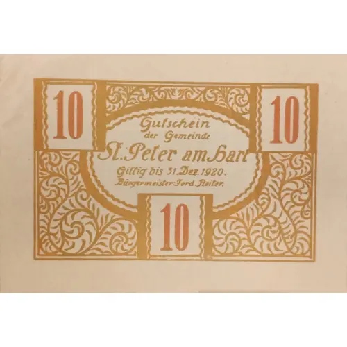 | Obverse description | 10 Heller, St. Peter am Hart, OÖ., Gemeinde |
