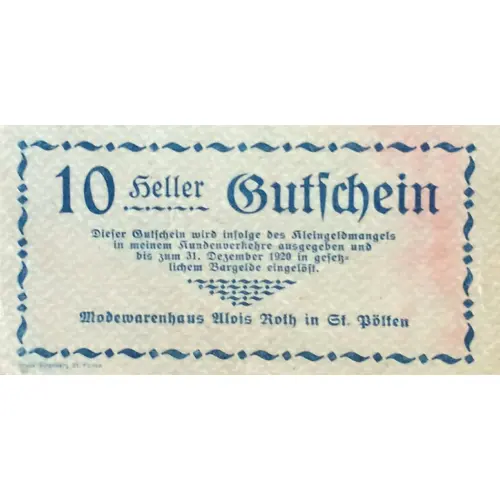 | Obverse description | 10 Heller, St. Pölten, NÖ., Prv.: Alois Roth, Modewarenhaus |