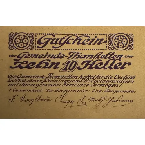 | Opis líce | Gutchein *Gemeinde-Thastetten über Zehn10 Heller Die Gemeinde hanstetten hafelfur die Verbin achheu, dieren /chein in geretu. Dargeldezulien mit ihrem geramten Semeinde Vermögen! / Semeinderat: Der Bürgermeister • Vire: Surgereider. |