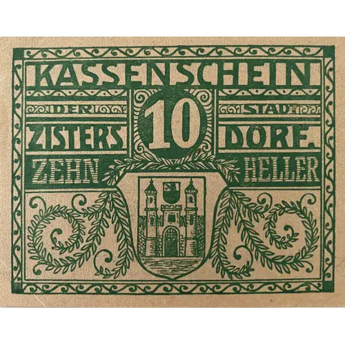 | Obverse lettering | Kassenschein der Stadt Zistersdorf ZEHN 10 HELLER |