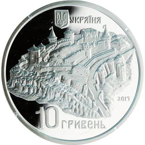 | Obverse description | Above are Ukraine`s small coat of arms and the legend УКРАЇНА (Ukraine); in the center against a smooth background is a layout of the old castle in the town of Kamianets-Podilsk; to the right is the coin issue year - 2017; beneath is the coin face value: 10 ГРИВЕНЬ (10 hryvnias). |