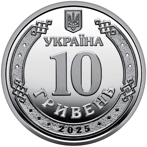 | Description de l’avers | Above is Ukraine’s small coat of arms; in the center, surrounded by an old Rus ornament is the following semicircular legend: УКРАЇНА/10/ ГРИВЕНЬ (Ukraine/10/hryvnias); against the backdrop of the ornament are the coins’ issue year – 2025 (beneath) and the mint mark of the NBU’s Banknote Printing and Minting Works (to the right). |