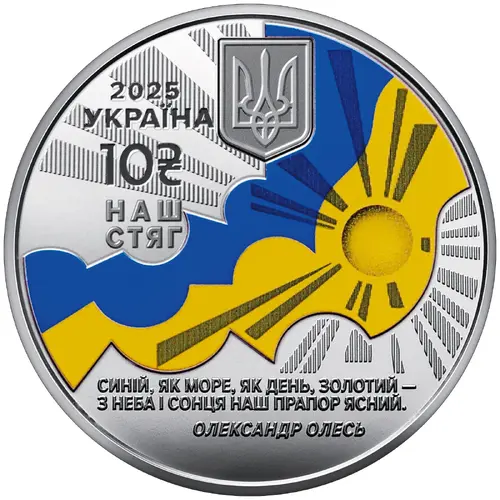 نوشته‌های روی سکه 2025 УКРАЇНА 10₴ НАШ СТЯГ СИНІЙ, ЯК МОРЕ, ЯК ДЕНЬ, ЗОЛОТИЙ – З НЕБА І СОНЦЯ НАШ ПРАПОР ЯСНИЙ. ОЛЕКСАНДР ОЛЕСЬ