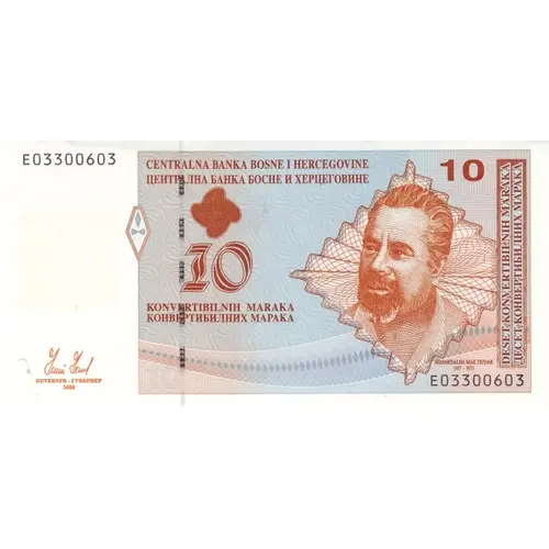 CENTRALNA BANKA BOSNE I HERCEGOVINE ЦЕНТРАЛНА БАНКА БОСНЕ И ХЕРЦЕГОВИНЕ 10 KONVERTIBILNIH MARAKA КОНВЕРТИБИЛНИХ МАРАКА DESET KONVERTIBILNIH MARAKA ДЕСЕТ КОНВЕРТИБИЛНИХ МАРАКА MEHMEDALIJA MAK DIZDAR 1917 - 1971 |