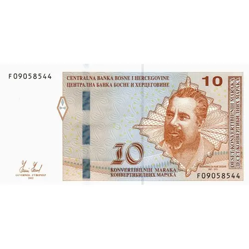 | Obverse lettering | CENTRALNA BANKA BOSNE I HERCEGOVINE ЦЕНТРАЛНА БАНКА БОСНЕ И ХЕРЦЕГОВИНЕ 10 KONVERTIBILNIH MARAKA 10 КОНВЕРТИБИЛНИХ МАРАКА DESET KONVERTIBILNIH MARAKA ДЕСЕТ КОНВЕРТИБИЛНИХ МАРАКА MEHMEDALIJA MAK DIZDAR 1917 1971 |