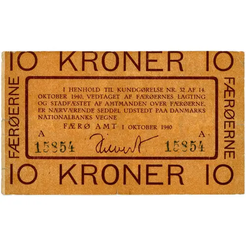 10 KRONER I HENHOLD TIL KUNDGØRELSE NR. 32 AF 14. OKTOBER 1940, VEDTAGET AF FÆRØERNES LAGTING OG STADFÆSTET AF AMTMANDEN OVER FÆRØERNE ER NÆRVÆRENDE SEDDEL UDSTEDT PAA DANMARKS NATIONALBANKS VEGNE FÆRØ AMT I OKTOBER 1940 10 KRONER |