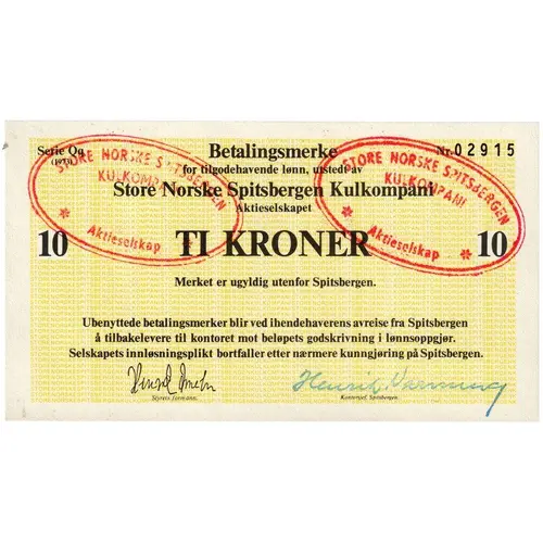 Obverse lettering Betalingsmerke for tilgodehavende lønn, utstedt av Store Norske Spitsbergen Kulkompani Aktieselskap 10 TI KRONER 10 Merket er ugyldig utenfor Spitsbergen. Ubenyttede betalingsmerker blir ved ihendehaverens avreise fra Spitsbergen å tilbakelevere til kontoret mot beløpets godskrivning i lønnsoppgjør. Selskapets innløsningsplikt bortfaller etter nærmere kunngjøring på Spitsbergen. Styrets formann Kontorsjef Spitsbergen