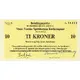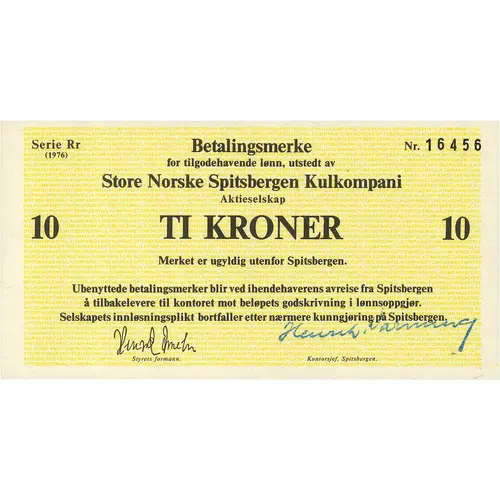 Betalingsmerke for tilgodehavende lønn, utstedt av Store Norske Spitsbergen Kulkompani Aktieselskap 10 TI KRONER 10 Merket er ugyldig utenfor Spitsbergen. Ubenyttede betalingsmerker blir ved ihendehaverens avreise fra Spitsbergen å tilbakelevere til kontoret mot beløpets godskrivning i lønnsoppgjør. Selskapets innløsningsplikt bortfaller etter nærmere kunngjøring på Spitsbergen. Styrets formann Kontorsjef Spitsbergen (Translation: Payment note issued by The Great Norwegian Spitsbergen Coal Company for due wages 10 kroner The note is invalid outside Spitsbergen. Unused payment notes must be returned upon the holder`s departure from Spitsbergen to the office againt the amount being credited on the payroll. The company`s obligation ceases after further announcement on Spitsbergen. Chairman of the board. Office manager, Spitsbergen.) |