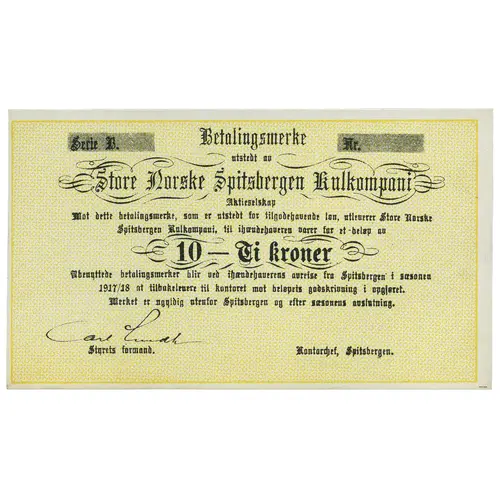 Betalingsmerke utstedt av Store Norske Spitsbergen Kullkompani Aktieselskap Mot dette betalingsmerke, som er utstedt for tilgodehavende løn, utleverer Store Norske Spitsbergen Kullkompani, til ihændehaveren varer for et -beløp av 10 - Ti kroner Ubenyttende betalingsmerker blir ved ihændehaverens avreise fra Spitsbergen i sæsonen 1917/18 at tilbakelevere til kontoret mot beløpets godskrivning i opgjøret. Merket er ugyldig utenfor Spitsbergen og efter sæsonens avslutning. Styrets formand. Kontordjef, Spitsbergen. (Translation: Payment note issued by The Great Norwegian Spitsbergen Coal Company Against this payment note, which is issued for outstanding wages, The Great Norwegian Spitsbergen Coal Company delivers to the bearer goods for an amount of 10 kroner Unused notes when the beares departs from Spitsbergen during the season 1917/18 is returned to the office against credit of the amount in the settlement. The note is invalid outside Spitsbergen and after the end of the season. Chairman of the board. Office manager, Spitsbergen.) |
