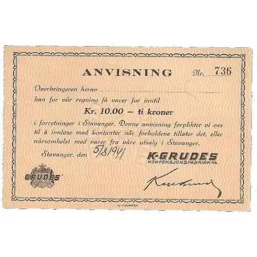 ANVISNING Overbringeren herav ....................... kan for vår regning få varer for inntil Kr. 10.00 - ti kroner i forretninger i Stavanger. Denne anvisningen forplikter vi oss til å innløse med kontanter når forholdene tillater det, eller nårsomhelst med varer fra våre utsalg i Stavanger. Stavanger, den K-GRUDES KONFEKSJONSFABRIKK A/S (printed signature) |