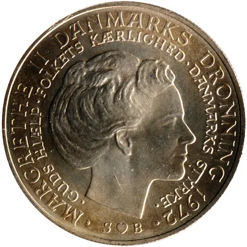 Portrait of queen Margrethe II looking right. Legends in 2 circles. |