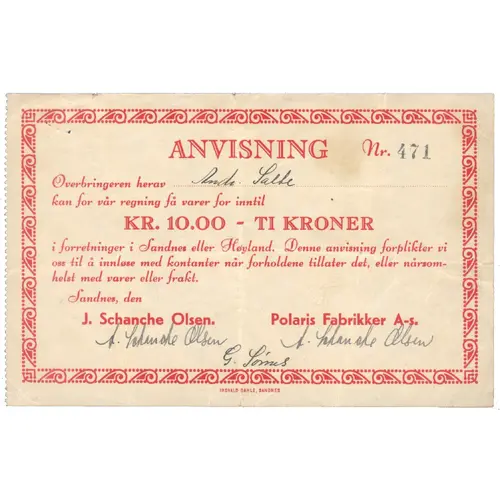 | Obverse lettering | ANVISNING Overbringeren herav ....................... kan for vår regning få varer for inntil KR. 10.00 - TI KRONER i forretninger i Sandes eller Høyland. Denne anvisning forplikter vi oss til å innløse med kontanter når forholdene tillater det, eller nårsom- helst med varer eller frakt. Sandes, den J. Schance Olsen Polaris Fabrikker A-s (handwritten signature) (handwritten signature) (handwritten signature) |