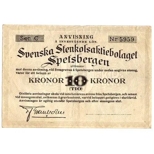 ANVISNING Å INNESTÅENDE LÖN. Svenska Stenkolsaktibolaget Spetsbergen utlämnar mot denna anvisning, vid Sveagruvan å Spetsbergen under nedan angivna säsong, varor för ett belopp av KRONOR 10 KRONOR (TIO) Oilösta anvisningar skola vid innehavarens avresa från Spetsbergen, och senast vid säsongens slut, avlämnas å gruvkontoret, varvid beloppet gottgöres i slutlikvid. Anvisningen är ogiltid utanför Spetsbergen och efter säsongens slut. (Translation: Payment note for outstanding wages. Swedish Rock Coal Company Spitsbergen LC gives the bearer against this payment by the Svea Mine in Spitsbergen goods for an amount of 10 kronor Unused notes when should when the bearet departs from Spitsbergen, and by the end of the season, be returned to the office, against credit of the amount in the settlement. The note is invalid outside Spitsbergen and after the end of the season.) |