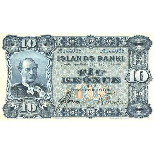 | Obverse lettering | Íslands banki greiðir handhafa gegn seðli þessum Tíu krónur i gulli. Reykjavík 1904. (Translation: The Bank of Iceland will pay the bearer against this banknote ten krónur in gold. Reykavik, 1904.) |