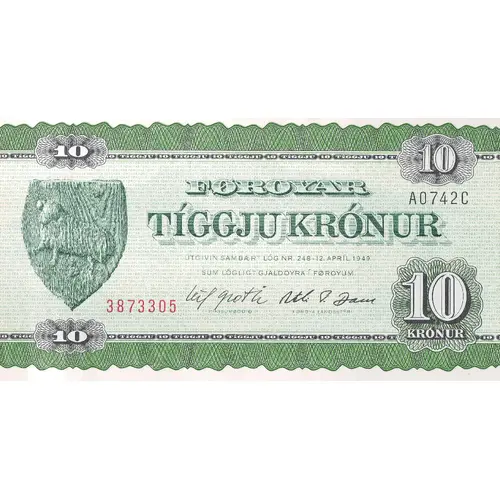 FØROYAR TÍGGJU KRÓNUR ÚTGIVIN SAMBÆRT LÓG NR. 248-12 APRÍL 1949 SUM LÓGLIGT GJALDOYRA Í FØROYUM (Translation: Faroe Islands, Issued under the law No. 248-April 12th 1949 as legal currency in the Faroe Islands) |