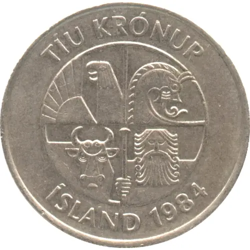 | Obverse lettering | TÍU KRÓNUR ÍSLAND 1984 (Translation: Ten Krónur Iceland) |