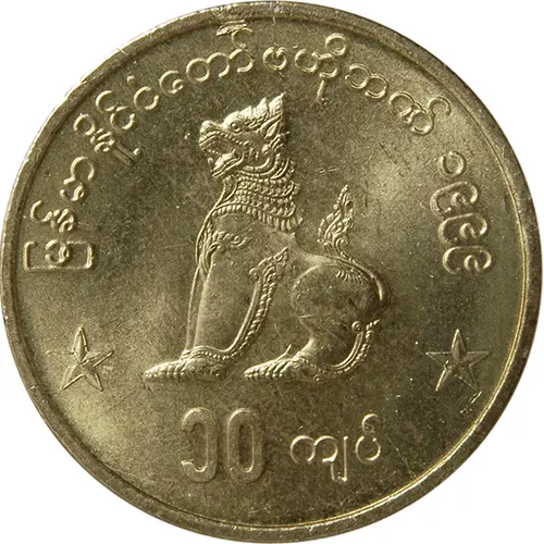 | Chữ khắc mặt trước | ★ မြန်မာနိုင်ငံတော်ဗဟိုဘဏ်၁ ၉၉၉၁ ★ ၁၀ ကျပ် (Translation: Central Bank of Myanmar 1999 10 Kyats) |
