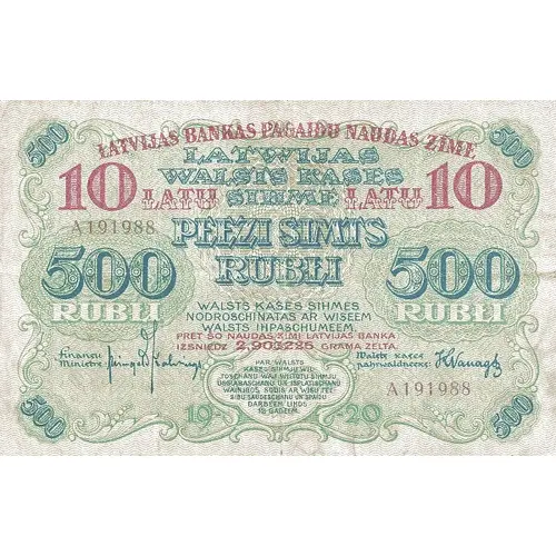 | Obverse lettering | LATWIJAS WALSTS KASES SIHME PEEZI SIMTS RUBLI 500 RUBLI WALSTS KASES SIHMES NODROSCHINATAS AR WISEEM WALSTS IHPASCHUMEEM 1920 LATVIJAS BANKAS PAGAIDU NAUDAS ZIME 10 LATU PRET SO NAUDAS ZIMI LATVIJAS BANKA IZSNIZOZ 2,903226 GRAMA ZELTA. (Translation: Latvia Walst Treasures Sihme Five Hundred Rubles 500 Rubles 1920 Latvia Bank`s Temporary Winter Money 10 Latu Against so money zimi Latvijas Bank cut 2.903226 grams of gold.) |