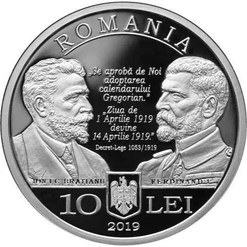 | Obverse lettering | ROMANIA `Se aprobă de Noi adoptarea calendarului Gregorian.` `ZIua de 1 Aprilie 1919 devine 14 Aprilie 1919.` Decret-lege 1053/1919 ION I.C. BRATIANU FERDINAND I 10 LEI 2019 (Translation: `It is approved by Us, the adoption of the Gregorian calendar.` `The day of 1st April 1919 becomes 14th April 1919.` Law 1053/1919) |