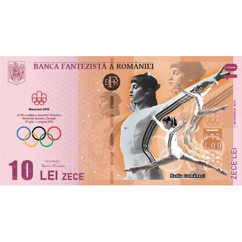 BANCA FANTEZISTA A ROMANIEI 10 BFR Montréal 1976 A XXI-a ediție a Jocurilor Olimpice Montréal Quebec Canada 17 iulie - 1 august 1976 DESIGNER Dani Crisan 10 LEI ZECE Nadia Comaneci ZECE LEI 1 DECEMBRIE 2024 |