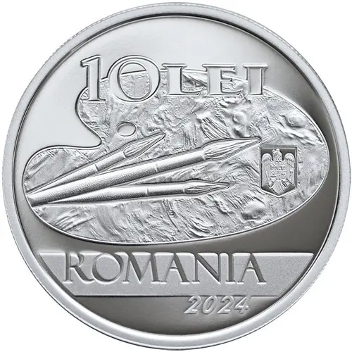 | Popis líce | A graphic composition in the form of a palette, the face value “10 LEI”, the coat of arms of Romania, the inscription “ROMANIA” and the year of issue “2024” |