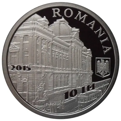 A vintage image of the Old Palace of the National Bank of Romania and of the statuary dedicated to Eugeniu Carada, the inscription “ROMANIA” in an arc, the coat of arms of Romania, the face value “10 LEI” and the year of issue “2015”. |