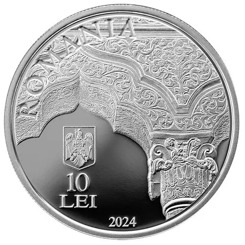 A Brâncovenesc-style motif in the porch of Stavropoleos Church, the inscription “ROMANIA” in an arc, the coat of arms of Romania, the face value “10 LEI”, and the year of issue “2024” |