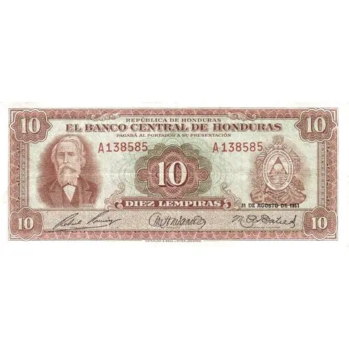 | Obverse lettering | REPÚBLICA DE HONDURAS EL BANCO CENTRAL DE HONDURAS PAGARÁ AL PORTADOR A SU PRESENTACIÓN 10 DIEZ LEMPIRAS 31 DE AGOSTO DE 1951 CABAÑAS PRESIDENTE GERENTE MINISTRO DE HACIENDA WATERLOW & SONS LIMITED, LONDRES (Translation: Republic of Honduras The Central Bank of Honduras will pay the bearer on presentation 10 Ten lempiras 31 of August of 1951 Cabañas President Manager Minister of Finance Waterlow & Sons Limited, London) |