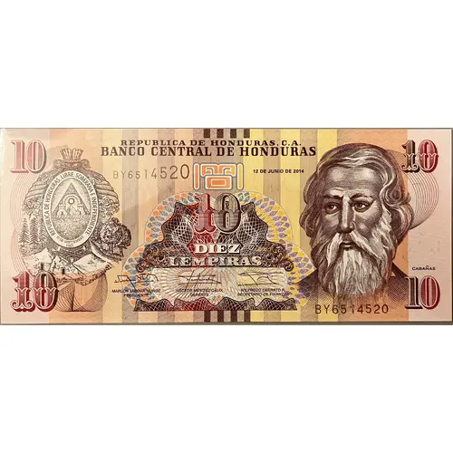| 表面の銘文 | 10 REPUBLICA DE HONDURAS. C.A. 10 BANCO CENTRAL DE HONDURAS 12 DE JUNIO DE 2014 REPUBLICA DE HONDURAS, LIBRE, SOBERANA E INDEPENDIENTE 15 DE SEPTIEMBRE 1821 CABAÑAS DIEZ LEMPIRAS MARLON TÁBORA MUÑOZ PRESIDENTE HÉCTOR MÉNDEZ CÁLIX GERENTE WILFREDO CERRATO R. SECRETARIO DE FINANZAS (Translation: 10 REPUBLIC OF HONDURAS. C.A. 10 CENTRAL BANK OF HONDURAS JUNE 12, 2014 REPUBLIC OF HONDURAS, FREE, SOVEREIGN AND INDEPENDENT SEPTEMBER 15 1821 CABAÑAS TEN LEMPIRAS MARLON TÁBORA MUÑOZ PRESIDENT HÉCTOR MÉNDEZ CÁLIX MANAGER WILFREDO CERRATO R. SECRETARY OF FINANCE) |