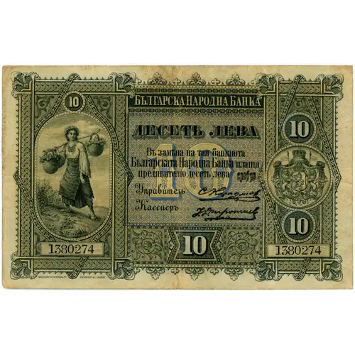 (Translation: Ten Leva Bulgarian National Bank In exchange of this banknote the The Bulgarian National Bank pays the bearer ten leva silver)