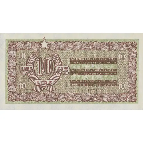 | Obverse lettering | 10 LIRA / LIR / LIRE Gospodarska banka za Istru Rijeku i Slovensko Primorje Gospodarska banka za Istro Reko in Slovensko Primorje Banca per l`Economica per l`Istria Fiume e il Littorale Sloveno 1945 (Translation: 5 Liras Economic bank for Istria Rijeka and Slovenian Coast 1945) |