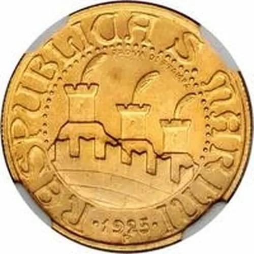 | Obverse lettering | RESPUBLICA S. MARINI PROVA DI STAMPA · 1925 · R (Translation: Republic of San Marino Trial) |
