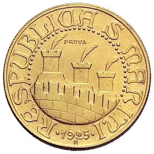| Obverse lettering | RESPUBLICA S. MARINI PROVA · 1925 · R (Translation: Republic of San Marino Trial) |