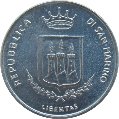 | Description de l’avers | Crowned arms of San Marino, sprig and motto below |