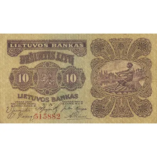 (Translation: Lithuanian Bank 10 Litas One Litas contains 0.150462 grams of pure gold. Kaunas, November 16, 1922)
