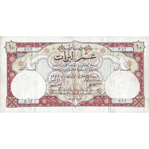 Reverse lettering BANQUE DE SYRIE ET DU LIBAN LIBAN LIBAN DIX LIVRES REMBOURSABLE AU PORTEUR EN CHÈQUE SUR PARIS A RAISON DE VINGT FRANCS PAR LIVRE C. SERVEAU FEC. G. BELTRAND SC.