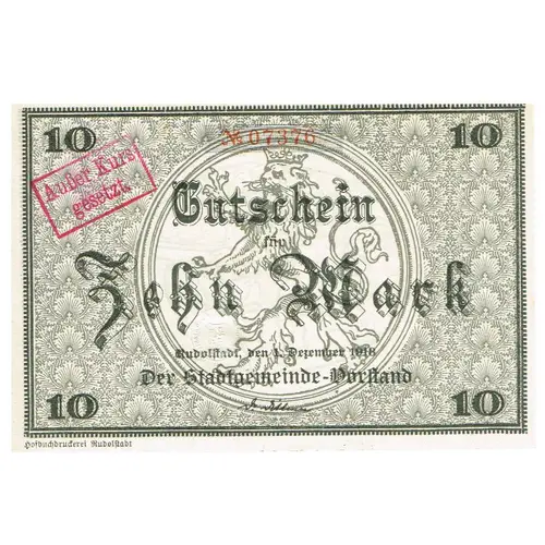 | Obverse lettering | Gutschein für Zehn Mark Rudolstadt, den 1. Dezember 1918 Der Stadtgemeinde-Vorstand |