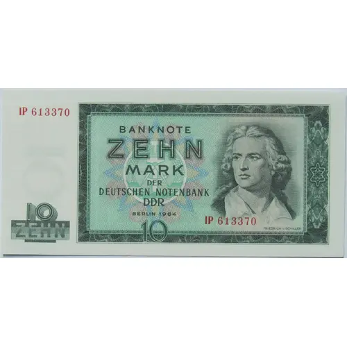 BANKNOTE ZEHN MARK DER DEUTSCHEN NOTENBANK DDR BERLIN 1964 10 FRIEDRICH v. SCHILLER 10 ZEHN (Translation: Banknote Ten marks of the German Central Bank GDR) |