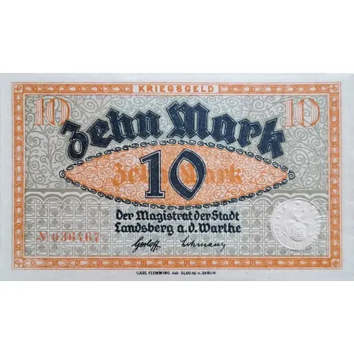 | Rückseitenlegende | 10 Mark 10 Dieser Schein wird ungültig, wenn er nicht einen Monat nach erfolgter Bekanntmachung in den hiesigen Zeitungen unserer Stadthauptkasse zur Zahlung vorgelegt wird. Der Magistrat der Stadt Landsberg a. d. Warthe. |