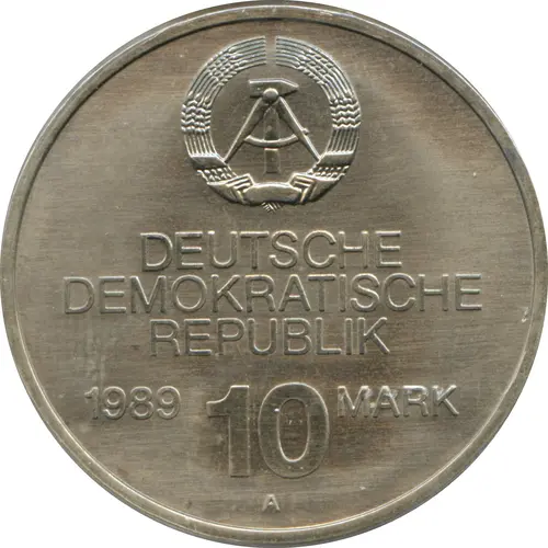 | Obverse lettering | DEUTSCHE DEMOKRATISCHE REPUBLIK 1989 10 MARK A (Translation: German Democratic Republic 1989 10 Mark A) |