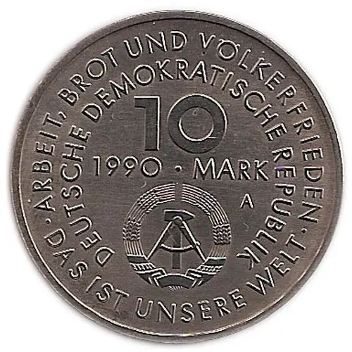 | Obverse lettering | ARBEIT, BROT UND VÖLKERFRIEDEN DEUTSCHE DEMOKRATISCHE REPUBLIK 10 1990 · MARK A ·DAS IST UNSERE WELT· (Translation: Labor, bread and peace German Democratic Republic 10 1990 · Mark A ·This is our world·) |