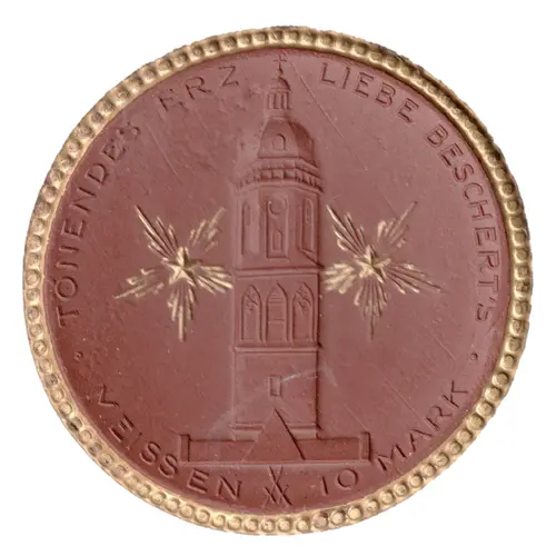 | Obverse lettering | TÖNENDES ERZ LIEBE BESCHERT`S MEISSEN 10 MARK |