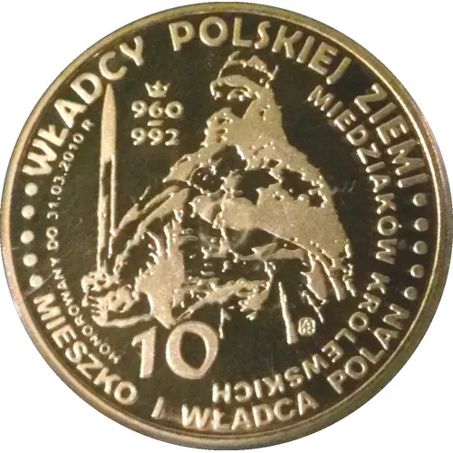 | Obverse lettering | WŁADCY POLSKIEJ ZIEMI MIESZKO I WŁADCA POLAN 10 MIEDZIAKÓW KRÓLEWSKICH |