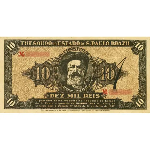 | Obverse lettering | 10 10 THESOURO DO ESTADO DE S.PAULO . BRAZIL PRÓ-CONSTITUIÇÃO 10 10 DOMINGOS JORGE VELHO DEZ MIL REIS O portador deste receberá no Thesouro do Estado de S. Paulo a quantia de 10$000 (dez mil réis) de accordo com o Decreto N.º 5585 de 14 de Julho de 1932. 10 10 COMP. MELHORAMENTOS DE SÃO PAULO (WEISZFLOG IRMÃOS INCORPORADA) S. PAULO - RIO - CAYEIRAS. (Translation: Treasury of the State of São Paulo. Brazil Pro-Constitution Domingos Jorge Velho Ten Thousand Réis The bearer of this will receive at the Treasury of the State of São Paulo the amount of 10$000 (ten thousand réis) in accordance with Decree No. 5585 of 14 July 1932. Companhia Melhoramentos de São Paulo (Weiszflog Brothers Incorporated) São Paulo - Rio - Cayeiras.) |