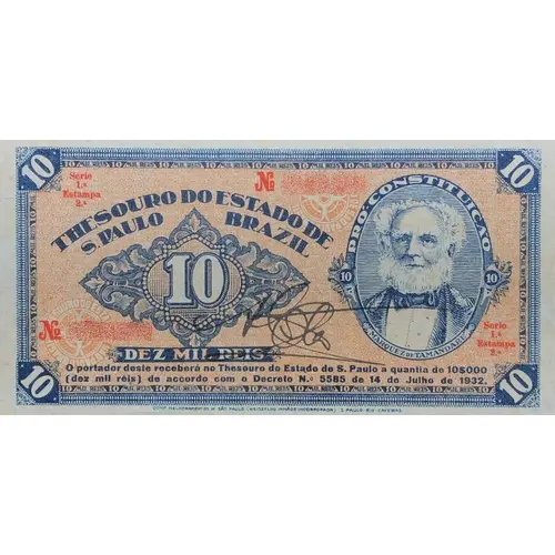 | Obverse lettering | 10 10 THESOURO DO ESTADO DE S. PAULO BRAZIL 10 DEZ MIL REIS PRÓ-CONSTITUIÇÃO 10 10 MARQUÊZ DE TAMANDARE O portador deste receberá no Thesouro do Estado de S. Paulo a quantia de 10$000 (dez mil réis) de accordo com o Decreto N.º 5585 de 14 de Julho de 1932. 10 10 COMP. MELHORAMENTOS DE SÃO PAULO (WEISZFLOG IRMÃOS INCORPORADA) S. PAULO - RIO - CAYEIRAS. (Translation: Treasury of the State of São Paulo. Brazil Ten Thousand Réis Pro-Constitution Marquis of Tamandaré The bearer of this will receive at the Treasury of the State of São Paulo the amount of 10$000 (ten thousand réis) in accordance with Decree No. 5585 of 14 July 1932. Companhia Melhoramentos de São Paulo (Weiszflog Brothers Incorporated) São Paulo - Rio - Cayeiras.) |