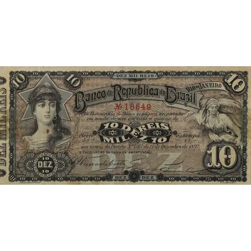 | Obverse lettering | 10 DEZ MIL RÉIS 10 BANCO DA REPUBLICA DO BRAZIL RIO DE JANEIRO NA THESOURARIA DO BANCO SE PAGARÁ AO PORTADOR EM MOEDA DE OURO E A VISTA, A QUANTIA DE DEZ MIL RÉIS NOS TERMOS DO DECRETO NUMERO 1167 DE 17 DE DEZEMBRO DE 1892. 10 DEZ 10 O THESOUREIRO DA CAIXA DA AMORTIZAÇÃO DEZ DEZ GIESECKE & DEVRIENT (Translation: 10 Ten Thousand Reis 10 Bank of the Republic of Brazil Rio de Janeiro In The Bank`s Treasury will be paid to the carrier in gold coin and sight, the amount of Ten Thousand Reis Under the terms of Decree Number 1167 of December 17, 1892. Ten Thousand Reis The Treasurer of the Amortization Fund Ten Ten Giesecke & Devrient) |