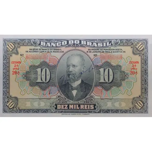 | Obverse lettering | 10 10 BANCO DO BRASIL NA SEDE DO BANCO DO BRASIL, SE PAGARÁ AO PORTADOR DESTA, DE ACCORDO COM A LEI N. 4635 DE 5 DE JANEIRO DE 1923, A QUANTIA DE 10 10 RODRIGUES ALVES 10 10 DEZ MIL REIS 10 10 AMERICAN BANK NOTE COMPANY (Translation: Bank of Brazil at Banco do Brasil`s Headquarters, it will be paid to the bearer of according to law no. 4635 of January 5, 1923, the amount of Ten Thousand Réis Rodrigues Alves American Bank Note Company) |