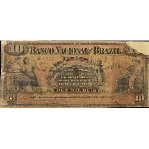 | Obverse lettering | BANCO NACIONAL DO BRAZIL, RIO DE JANEIRO. Na Thesouraria do Banco se pagará ao portador em moeda de ouro e à vista a quantia de DEZ MIL REIS Nos termos do Decreto nº 253 de 8 de Março de 1890. 10 American Bank Note Co., New York (Translation: National Bank of Brazil, Rio de Janeiro The Bank`s Treasury will pay to the bearer in gold coin and at sight the amount of Ten Thousand Reis Under the terms of Decree No. 253 of March 8, 1890. American Bank Note Co., New York) |
